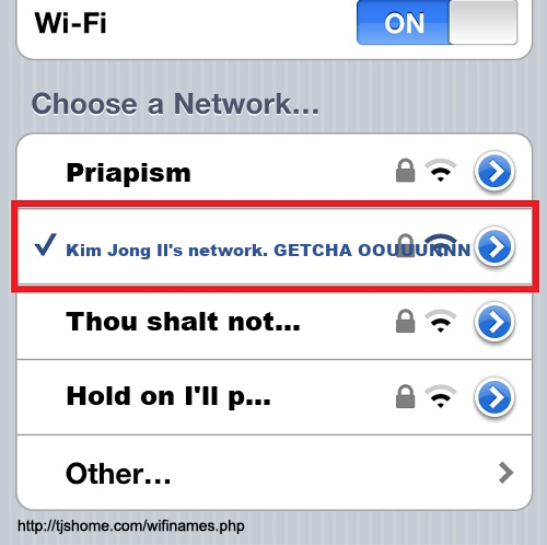 Funny WiFi Name #4842 [Kim Jong Il's network. GETCHA OOUUUNNN!!! ]