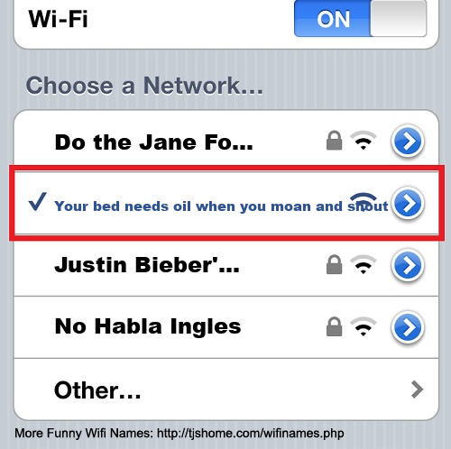 Funny WiFi Name #5140 [Your bed needs oil when you moan and shout ]