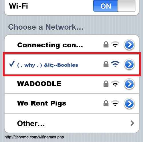 Funny WiFi Name #5196 [( . why . ) <--Boobies ]