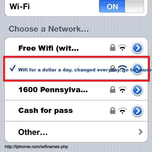 Funny WiFi Name #5376 [Wifi for a dollar a day. changed everyday. go to house # 3 ]