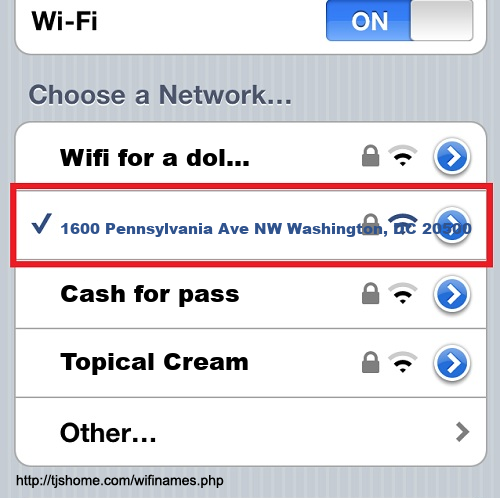 Funny WiFi Name #5377 [1600 Pennsylvania Ave NW Washington, DC 20500 ]