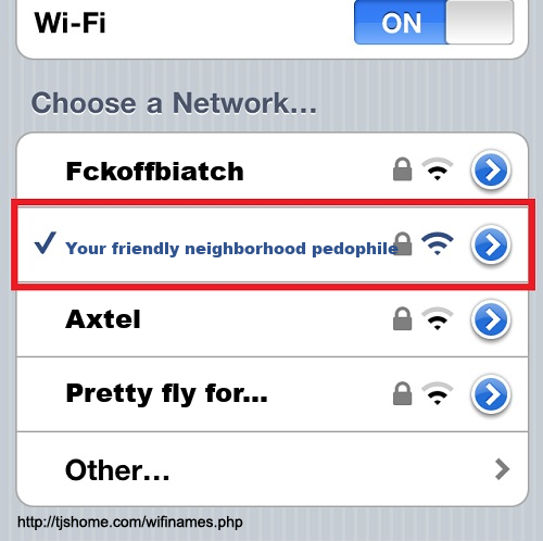 Funny WiFi Name #5511 [Your friendly neighborhood pedophile ]