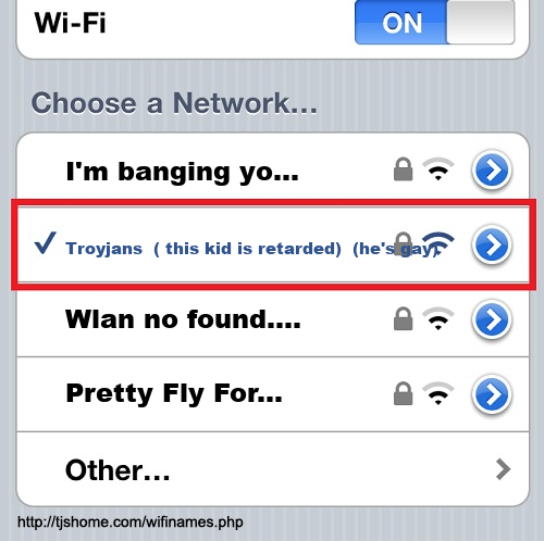 Funny WiFi Name #5595 [Troyjans ( this kid is retarded) (he's gay) ]