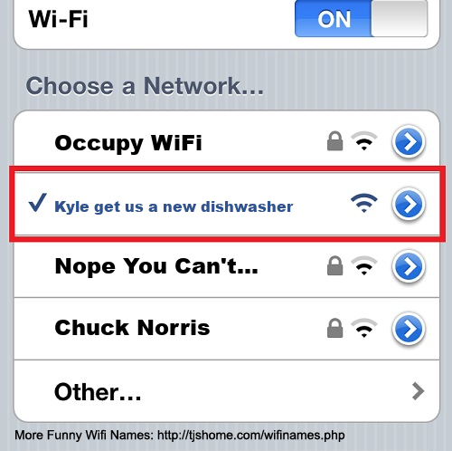 Funny WiFi Name #5610 [Kyle get us a new dishwasher! ]