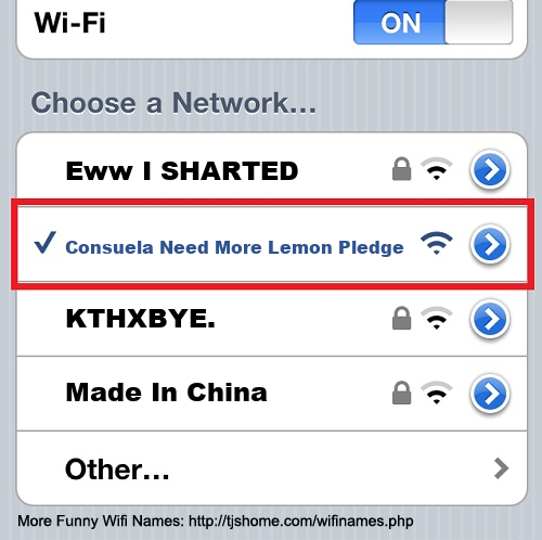 Funny WiFi Name #5918 [Consuela Need More Lemon Pledge ]