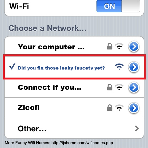 Funny WiFi Name #5973 [Did you fix those leaky faucets yet? ]