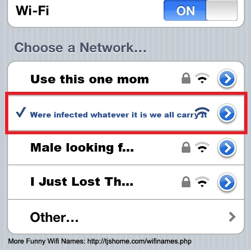 Funny WiFi Name #5994 [Were infected whatever it is we all carry it ]