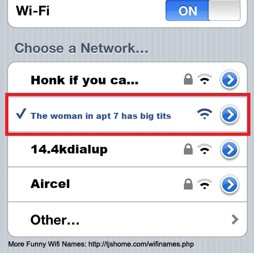 Funny WiFi Name #6266 [The woman in apt 7 has big tits ]