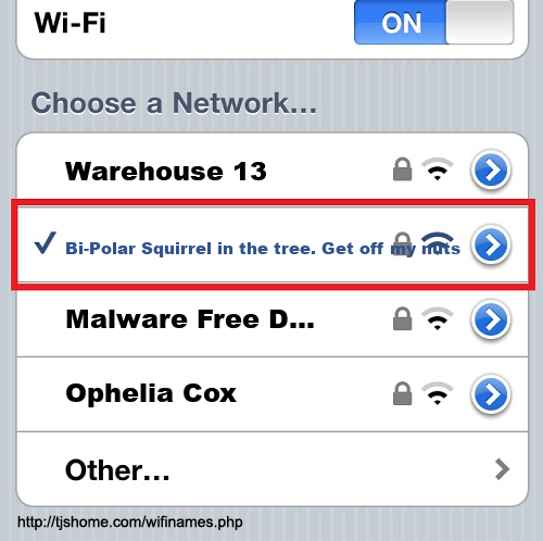 Funny WiFi Name #6331 [Bi-Polar Squirrel in the tree. Get off my nuts! ]