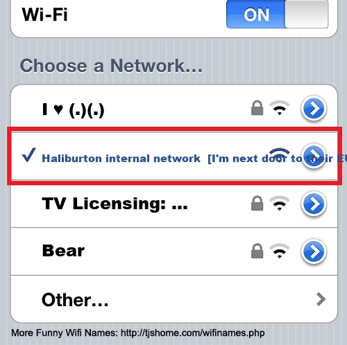 Funny WiFi Name #7153 [Haliburton internal network [I'm next door to their EU headquarters] ]