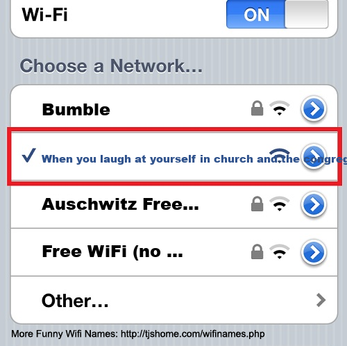 Funny WiFi Name #7399 [When you laugh at yourself in church and the congregation laughs back because you tell your own joke for weeks and even years ]