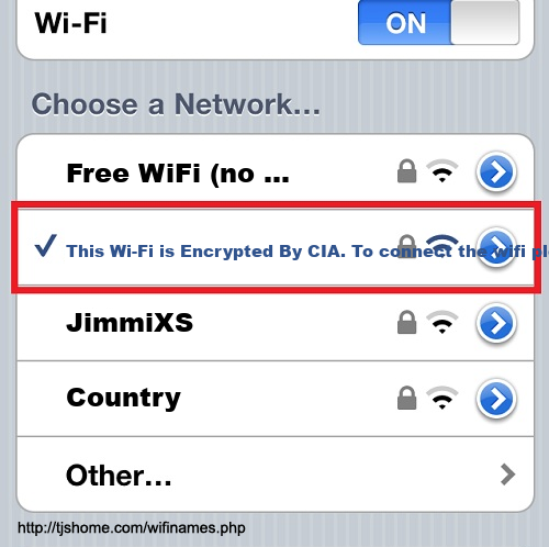 Funny WiFi Name #7404 [This Wi-Fi is Encrypted By CIA. To connect the wifi please contact CIA ]