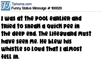- # 151790 I was at the pool today and tried to sneak a quick pee in the deep end. The lifeguard must have seen me. He blew his whistle so loud that I almost fell in.