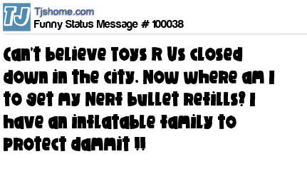 X is Can't believe Toys R Us closed down in the city. Now where am I to get my Nerf bullet refills? I have an inflatable family to protect dammit !!