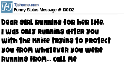 X Dear girl running for her life, I was only running after you with the knife trying to protect you from whatever you were running from... call me
