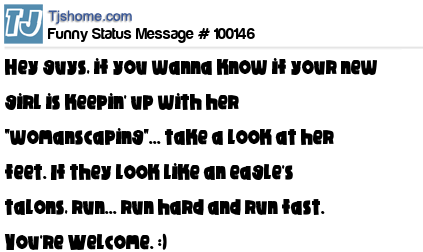 X Hey guys, if you wanna know if your new girl is keepin' up with her "womanscaping"... take a look at her feet. If they look like an eagle's talons, run... run hard and run fast. You're Welcome. :)