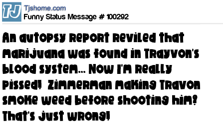 X is An autopsy report reviled that marijuana was found in Trayvon's blood system... Now I'm really pissed! Zimmerman making Travon smoke weed before shooting him? That's just wrong!