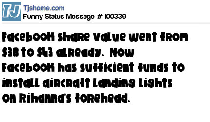 X is Facebook share value went from $38 to $43 already. Now Facebook has sufficient funds to install aircraft landing lights on Rihanna's forehead.