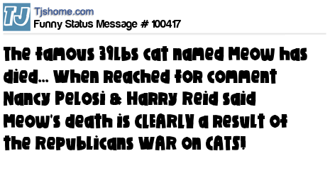 X The famous 39lbs cat named Meow has died... When reached for comment Nancy Pelosi & Harry Reid said Meow's death is CLEARLY a result of the Republicans WAR on CATS!