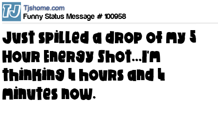 X Just spilled a drop of my 5 Hour Energy Shot...I'm thinking 4 hours and 4 minutes now.