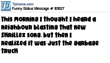 X is This morning I thought I heard a neighbour blasting that new Skrillex song, but then I realized it was just the garbage truck