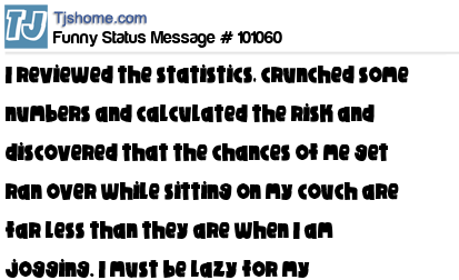 X  I reviewed the statistics, crunched some numbers and calculated the risk and discovered that the chances of me get ran over while sitting on my couch are far less than they are when I am jogging. I must be lazy for my wellbeing.......