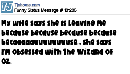 X My wife says she is leaving me because because because because becaaaaauuuuuuuuse,,, she says I'm obsessed with the Wizard of Oz.