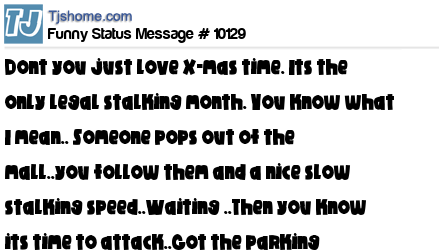 X Dont you just love X-mas time. Its the only legal stalking month. You know what I mean.. Someone pops out of the mall..you follow them and a nice slow stalking speed..Waiting ..Then you know its time to attack..Got the parking stall. Mission accomplished!