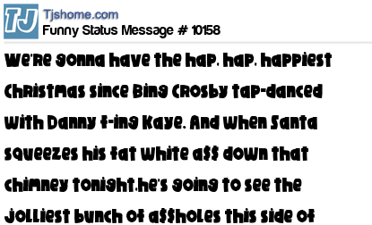 X is We're gonna have the hap, hap, happiest Christmas since Bing Crosby tap-danced with Danny f-ing Kaye. And when Santa squeezes his fat white a$$ down that chimney tonight,he's going to see the jolliest bunch of a$$holes this side of the nuthouse!