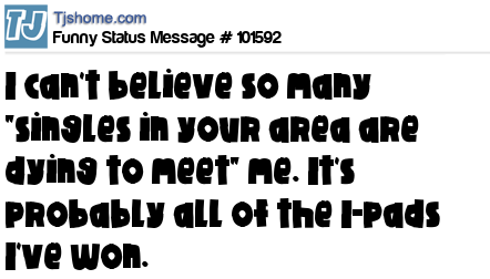 X is I can't believe so many "singles in your area are dying to meet" me. It's probably all of the I-pads I've won.