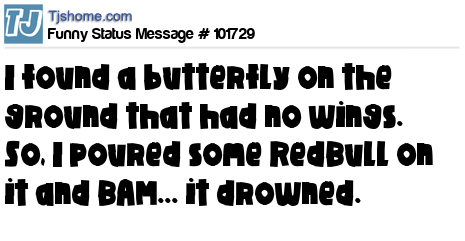 - # 80337 saw a butterfly today with no wings, so I poured red bull on it and BAMMMM... it died :(