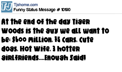 X is At the end of the day Tiger Woods is the guy we all want to be: $600 million, 75 Cars, Cute dogs, Hot Wife, 3 hotter girlfriends....Enough Said!
