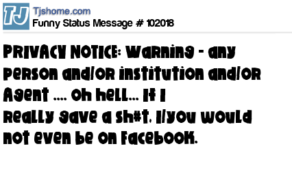 X PRIVACY NOTICE: Warning - any person and/or institution and/or Agent .... oh hell... If I really gave a sh#t, I/you would not even be on Facebook.