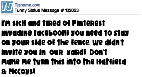 X is I'm sick and tired of Pinterest invading Facebook! you need to stay on your side of the fence, we didn't invite you in  our  yard!  Don't make me turn this into the Hatfield & McCoys!