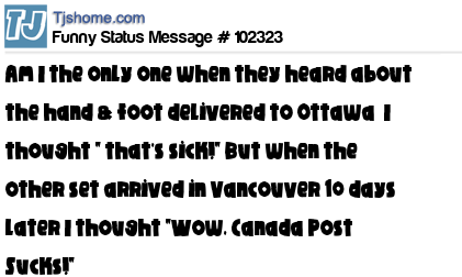 X Am I the only one when they heard about the hand & foot delivered to Ottawa I thought " that's sick!" But when the other set arrived in Vancouver 10 days later I thought "Wow, Canada Post Sucks!"