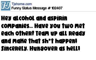 X  Hey alcohol and aspirin companies... Have you two met each other? Team up all ready and make that sh*t happen!  Sincerely, Hungover as hell!
