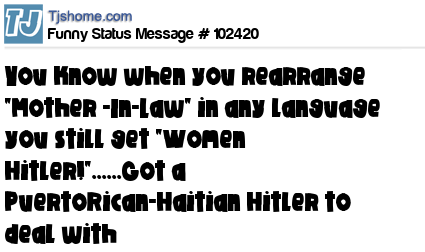 X You know when you rearrange "Mother -In-Law" in any language you still get "Women Hitler!"......Got a PuertoRican-Haitian Hitler to deal with