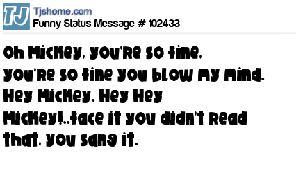 X Oh Mickey, you're so fine, you're so fine you blow my mind. Hey Mickey. Hey Hey Mickey!..face it you didn't read that, you sang it.