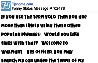 X If you use the term YOLO, then you are more than likely using these other popular phrases: “Would you like fries with that?” “Welcome to Walmart.” “Yes Officer. You may search my car under the terms of my probation.”