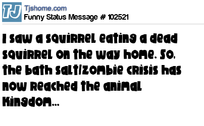X I saw a squirrel eating a dead squirrel on the way home. So, the bath salt/zombie crisis has now reached the animal kingdom...