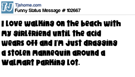 - # 132876 I love walking on the beach with my girlfriend. Until the LSD wears off and I'm just dragging a stolen mannequin around a car park.
