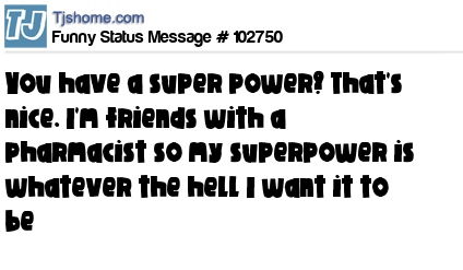 X says You have a super power? That's nice. I'm friends with a pharmacist so my superpower is whatever the hell I want it to be