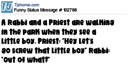 X A Rabbi and a Priest are walking in the park when they see a little boy. Priest: "Hey let's go screw that little boy" Rabbi: "Out of what?"
