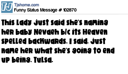 X This lady just said she's naming her baby Nevaeh b/c its Heaven spelled backwards. I said, just name her what she's going to end up being. Tulsa.