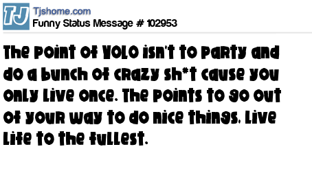 X is The point of YOLO isn't to party and do a bunch of crazy sh*t cause you only live once. The points to go out of your way to do nice things, live life to the fullest.