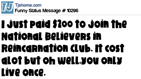 X I just paid $200 to join the National Believers in Reincarnation Club. It cost alot but oh well,you only live once.