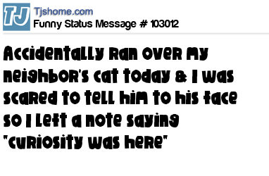 - # 103180 Just ran over my neighbor's cat, but I left a note saying "Curiosity was here" I'm probably safe, right?