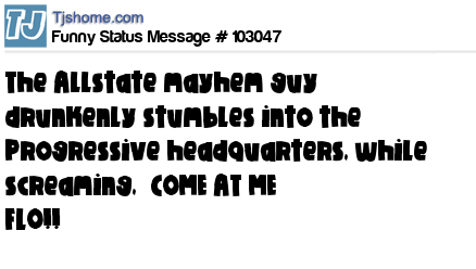 X The Allstate mayhem guy drunkenly stumbles into the Progressive headquarters, while screaming, “COME AT ME FLO!!”