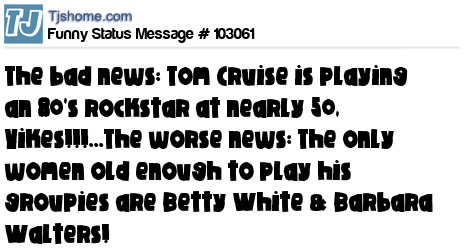 X The bad news: Tom Cruise is playing an 80's rockstar at nearly 50, Yikes!!!...The worse news: The only women old enough to play his groupies are Betty White & Barbara Walters! ツ