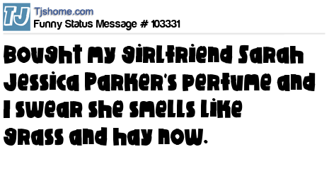 X says Bought my girlfriend Sarah Jessica Parker's perfume and I swear she smells like grass and hay now.
